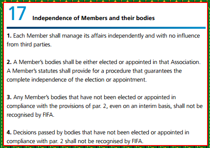 其中第17款第1條明確指出:國際足聯下屬成員組織要做到其運作的獨立性,不受“第三方”干擾;第2條也清晰地規定,下屬組織在選舉換屆的過程中要保證完全的獨立性(complete independence)。