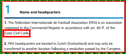 從中我們瞭解,FIFA是總部設在瑞士蘇黎世的,按照瑞士民法典(Swiss civil code)第60款有關“商業註冊”條文成立的組織。第60款強調了組織設立的“成文法”屬性,並且明確規定如果總部要搬離蘇黎世的話,必須要經過國際足聯大會的批准。