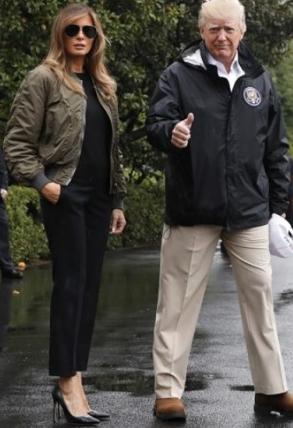 據台灣聯合新聞網報道,梅拉尼婭穿着黑色緊身褲、袖子折皺處理的軍綠色飛行員夾克,戴着飛行員墨鏡。特朗普穿得比較像政治人物視察災情時的樣子:黑色連帽防水外套、卡其褲和厚底短筒靴。