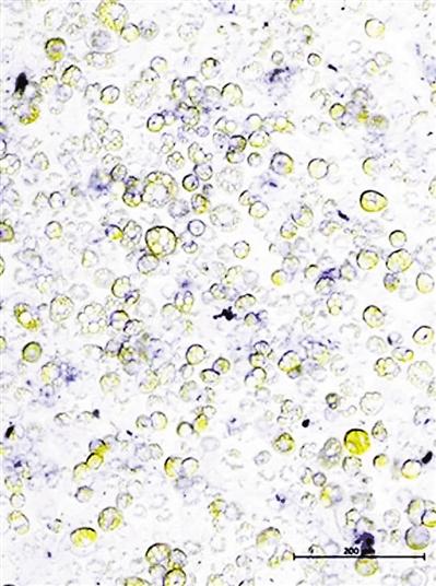 紡錘狀的脂肪前體細胞在接受了灰塵提取物的處理後,形狀變得更圓。藍色(DNA)標記變多表明細胞數量增多,黃色脂質染色顯示的是脂肪。我們可以觀察到處在各個發展階段的細胞——有些黃色脂質基本上已經佔據整個細胞空間。