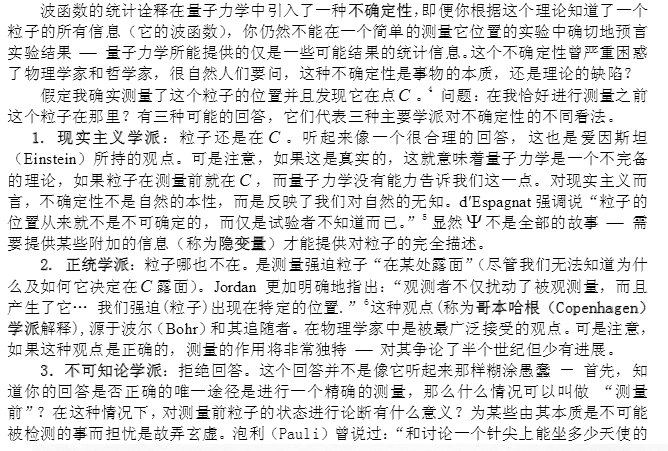 根據你對哥本哈根學派的批評,對玻姆的支持,我猜想你應該也是和愛因斯坦、玻姆一樣,在這個問題上持現實主義態度的。我不知道今天依然有很多物理學家,包括潘建偉這樣在第一線做實驗取得很大成績的,在這個問題上偏向唯心解釋的原因是什麼。