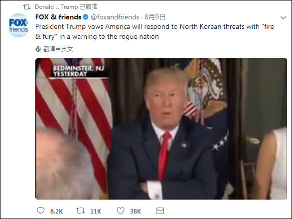 8月8日,特朗普曾表示如果朝鮮繼續升級核威脅,美國將以世界前所未見的“烈火般的暴怒”予以反擊。