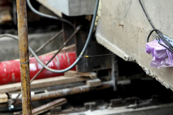 大雄寶殿底部托盤梁與滑移軌道間裝上了千斤頂,利用水平千斤頂頂推上托盤梁,可使大雄寶殿沿着軌道方向滑移到新的位置。圖中可以看到大雄寶殿底部與原基礎切斷。