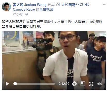 9月8日,因“煽惑他人蔘與非法集會罪”和“參與非法集會罪”被判入獄的“香港眾志”秘書長黃之鋒,更是在臉書上發文揚言,“希望大家關注近日學界民主牆事件,不但只是中大問題,而是整個學界的言論自由受到打擊。”