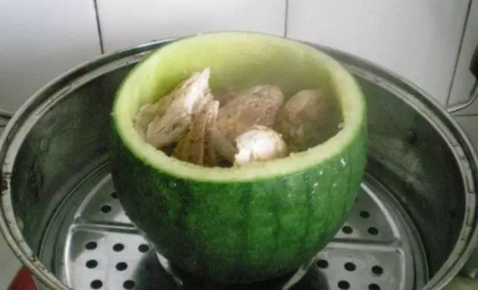 那就用最清涼的西瓜做容器!機智的廚師把雞放進了西瓜。
