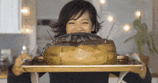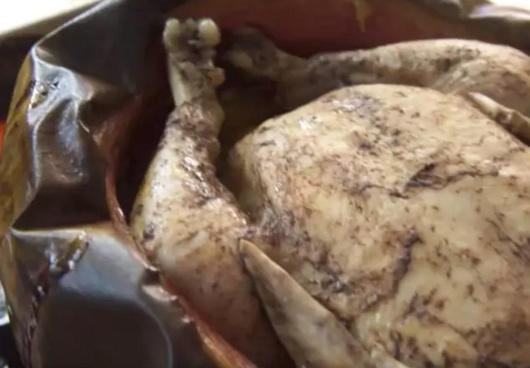 Emmy將雞從烤箱端出……它長這樣:黑色的皮膚就像一個塞滿的垃圾袋。