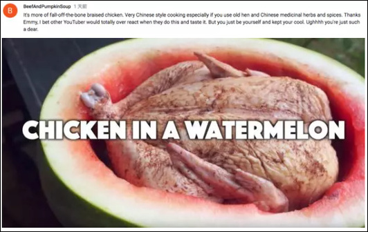 但是!論黑暗誰都比不上Emmy(YouTube上一位美食博主——觀察者網注),所有人看完她的西瓜雞都驚呆了。