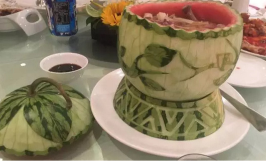 外面是雕龍刻鳳的西瓜皮,裏面是滋補的雞湯。看到它我也是一臉懵逼… 這真的不是黑暗料理嗎?