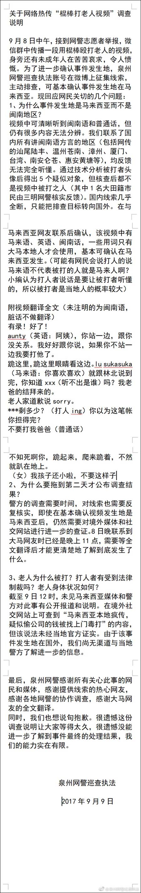 9月9日,泉州網警發佈調查結果,經多方求證,視頻發生在馬來西亞,“在與馬來西亞網友聯繫後確認,該視頻中有馬來語、英語、閩南語,一些用詞只有大馬本地人才會使用,基本可確認在馬來西亞發生。”