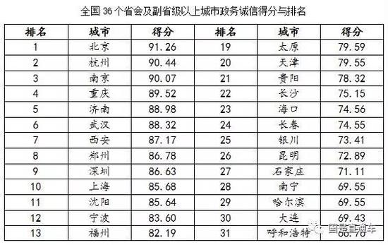 全國36個省會及副省級城市 最誠信的政府是誰?