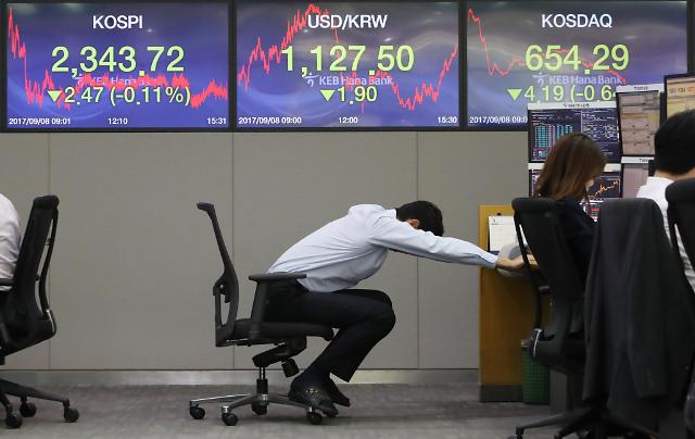 9月8日,KOSPI收盤報2343.72點,較前一交易日下跌2.47點。與中國相關企業股價一致下跌。(圖片來自韓聯社)