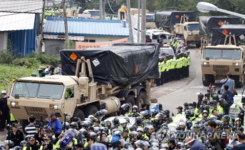 9月7日上午,在慶尚北道星州郡,韓國警方護送“薩德”裝備駛近基地。基地位於首爾以南300公里(圖片來自韓聯社)