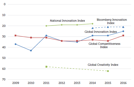 全球創新指數(GII),上圖為部分國家歷年的分數,下圖為這些國家歷年的排名