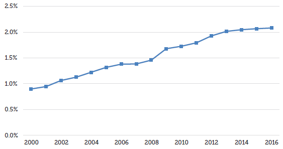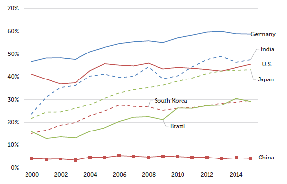 作者肯定了中國專利數量的增長,在2000年才有17萬件,但到2015年就有280萬件申請。但是作者也提到中國的專利幾乎都不在其他司法管轄區,也就是説國際化水平很低,而且未能帶來大量的專利授權費用,來自海外的更少。美國的專利授權費用幾乎是中國的100倍。