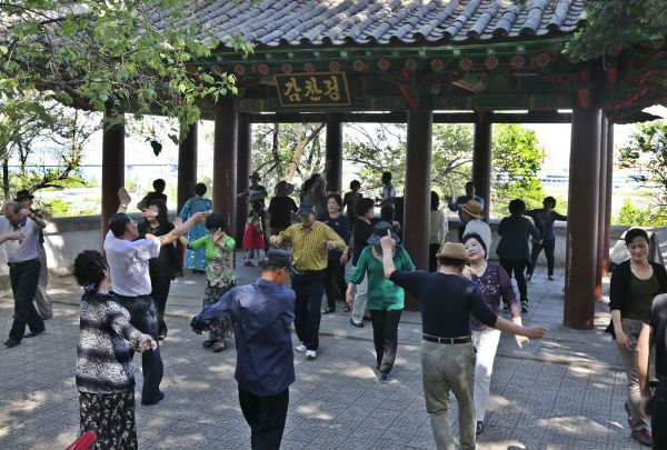 今年5月1日,在朝鮮平壤牡丹峯山麓,民眾跳舞慶祝國際勞動節。(新華社)