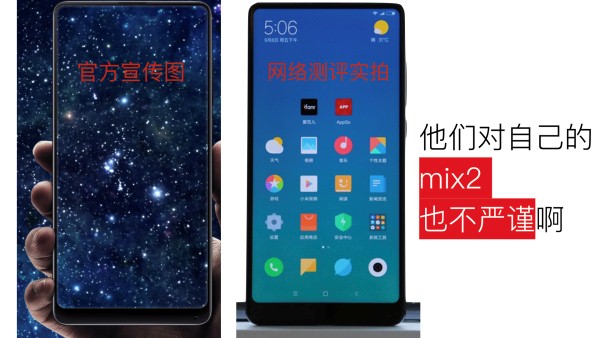 上圖根據圖片右下方的水印,源自小米實驗室,而在圖片中,iPhone 7 Plus連耳機孔都清晰可見,而小米MIX2則打造的美輪美奐。下圖是小米MIX2官方宣傳圖和網絡測評拍照的對比,很明顯,小米官方宣傳圖中,邊框被做的更窄,手機底部的下巴也做了優化。