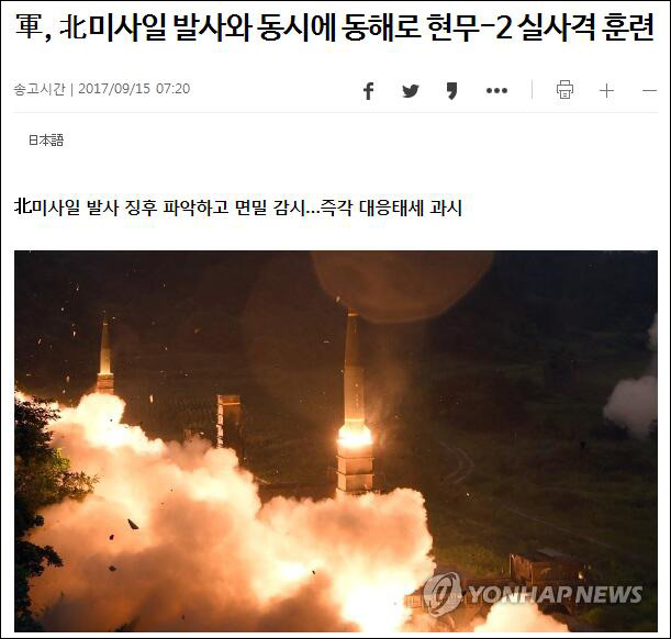 韓聯社9月15日報道,韓國軍方宣佈,在朝鮮發射導彈的同時,韓國發射了一枚玄武-2地對地導彈。