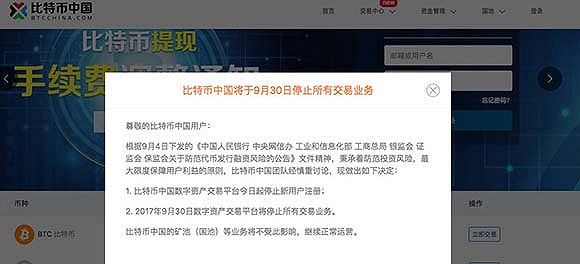 9月14日晚7點,比特幣國內最大的交易平台之一“比特幣中國”發公告稱:該數字資產交易平台今日起停止新用户註冊;2017年9月30日數字資產交易平台將停止所有交易業務。