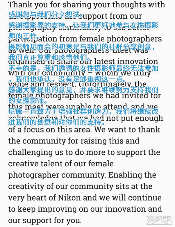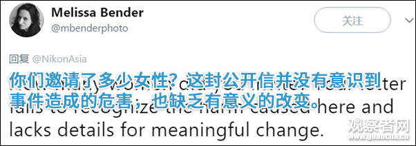 尼康亞洲也在推特上發表聲明,解釋沒有女性的原因:我們邀請的女性攝影師無法參加此次活動,我們也承認沒有留心性別比例這一點。