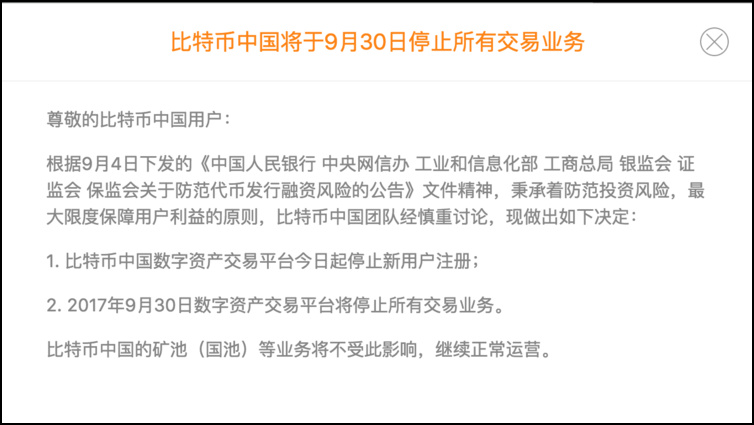2017年9月14日晚間,中國三大比特幣交易平台之一的比特幣中國(BTCCHINA.COM)發出公告,其將於9月30日停止所有交易,並停止新用户註冊。