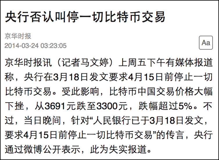 央行甚至在2014年3月針對媒體傳言“叫停一切比特幣交易”進行了官方闢謠。