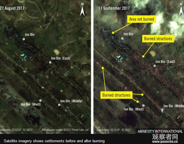 據英國《衞報》當地時間9月14日報道,國際人權組織“大赦國際”提交的衞星圖像顯示,大火吞沒了緬甸若開邦的大片地區,這引發各界指責,質疑緬甸軍隊正採取蓄意和系統的“焦土政策”,以驅趕該地區的羅興亞穆斯林。