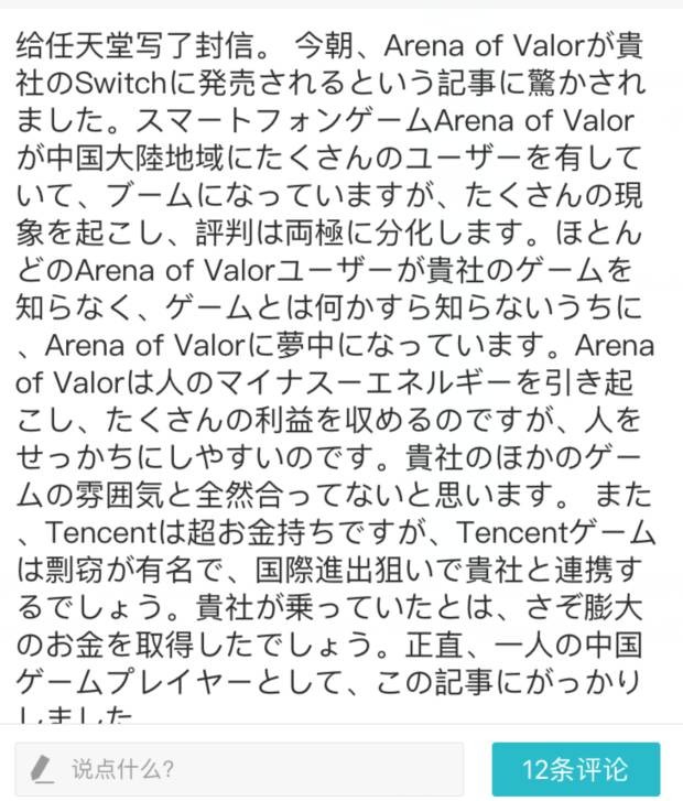 今天早上,我被王者榮耀要在貴公司的switch上發賣的消息震驚到了。手遊王者榮耀在中國大陸地區有很多的用户,非常火爆,也產生了很多現象,評論兩極分化。幾乎玩王者榮耀的用户都不知道貴公司的遊戲,連遊戲是什麼都不知道的時候,就迷上王者榮耀了。王者榮耀容易讓人產生負能量,獲取了很大的利潤,還容易讓人變得急躁。我認為與貴社的其他遊戲氛圍完全不合。另外,騰訊雖然非常有錢,但卻以抄襲著稱,所以想跟瞄準海外市場的貴社聯合吧。借貴社之手又能賺取更多錢財吧。説實話,我作為一箇中國遊戲玩家,對這個消息感到很失望。