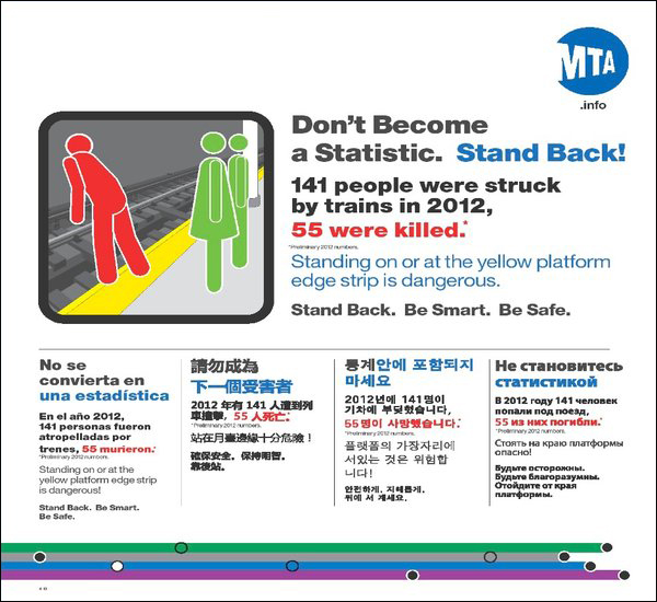 MTA張貼的提醒旅客不要站在月台邊緣告示