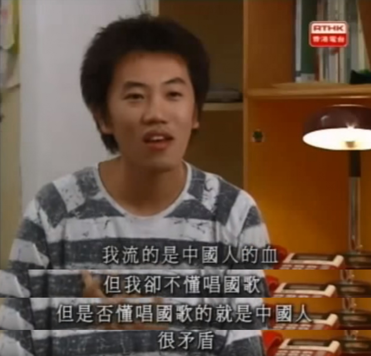 值得注意的是,他當年也在節目中談及香港人身份認同問題,表示(在北京)港、澳、台學生不被視為本地生,也不被視為留學生。當時他問,“我流緊中國人嘅血,但系我又唔識唱國歌,但繫系咪代表識唱國歌嘅就係中國人呢?(我流着中國人的血,但我又不會唱國歌,但是不是會唱國歌就是中國人呢?)”並對此感到很矛盾。