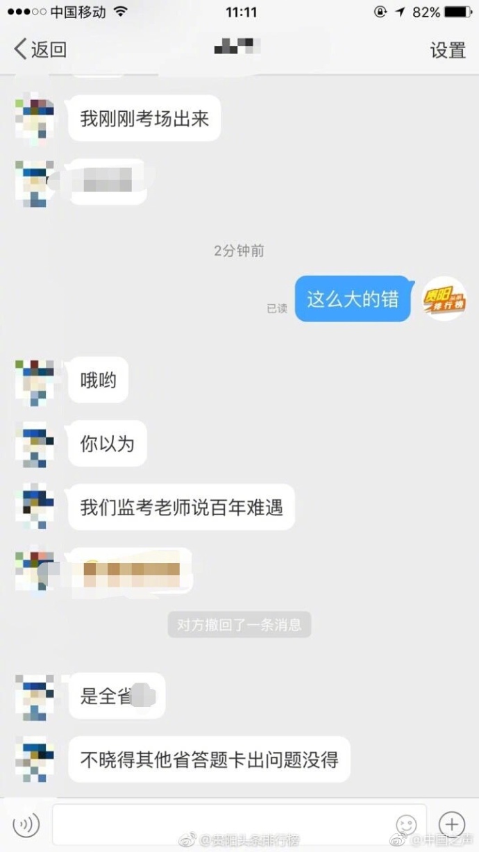 貴州省招生考試院今日回應稱經過核實發現答題卡無第16—20題答案填塗點。立即通知全省所有考點考場,要求全體考生將第16—20題題號及答案填寫在答題區空白處,並對考試時間進行順延調整。將對造成事件相關責任人員進行嚴肅處理。