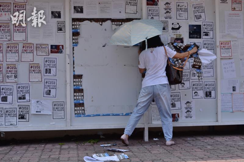 17日下午,一白衣女子撕掉港中大民主牆上大片“港獨”海報(圖片來自港媒)