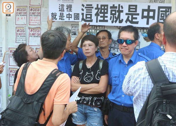此外,下午2點半左右,香港“愛護香港力量”社團十多人手持“這裏就是中國”標語到港中大民主牆前表態,有人一度在民主牆成功貼上該標語,有在場港中大學生會代表讓其張貼在民主牆空白位置,多名保安人員到民主牆前戒備。隨後,“愛護香港力量”十多人坐在民主牆前空地表達不滿,一度高喊“Hong Kong is China”、‘“這裏就是中國”的口號。