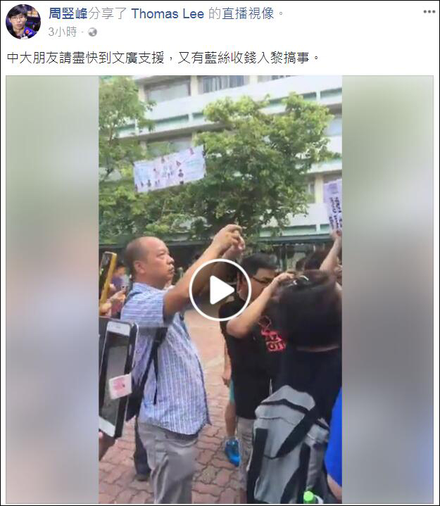 報道還稱,早前罵內地生“滾回支那”的港中大學生會前會長周豎峯,又一度與在場持相反意見人士互相指罵,並在臉書上分享視頻直播,鼓動人來現場。