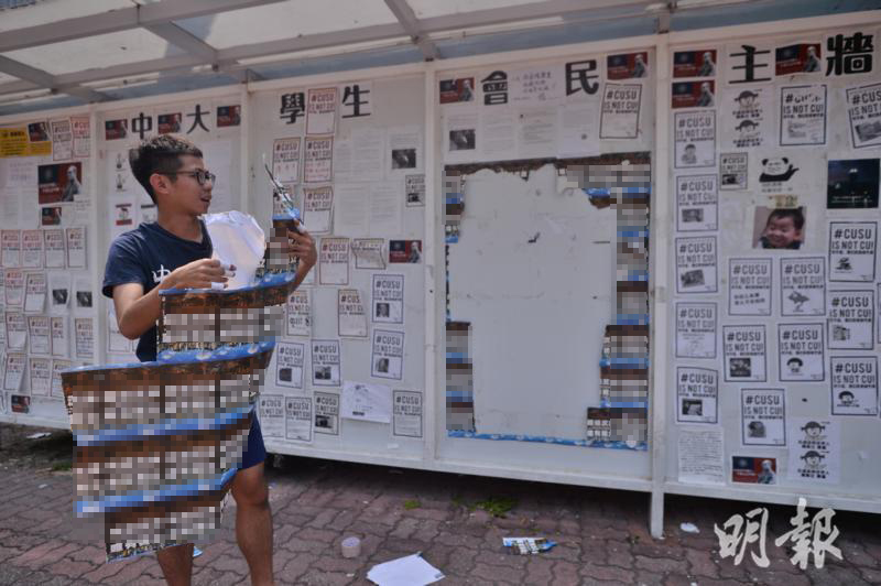 隨後,一名白衣女子突然大幅度撕走民主牆上的海報,差不多整牆的“港獨”海報被撕掉。當班看守的港中大學生會外務秘書李文耀上前阻止並質問身份,該女士並沒回應,隨後乘坐私人轎車離開。
