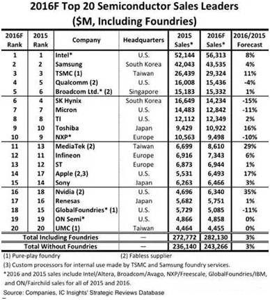 台灣聯電更是台灣僅次於台積電的是第二大集成電路製造廠,2016年銷售額44.5億美元,對比下中芯國際2016年的銷售收入只有29億美元多點。