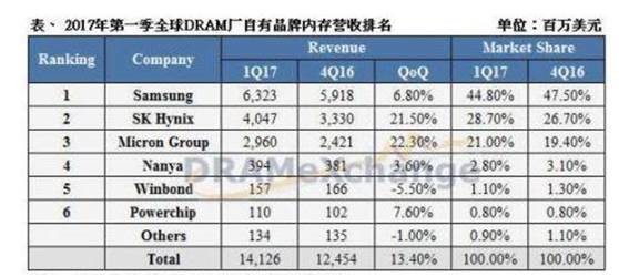 2017年第二季度,三星電子、SK海力士、美光科技三家業內巨頭DRAM銷售額達44.3億美元,比上季度增長了30.1%。