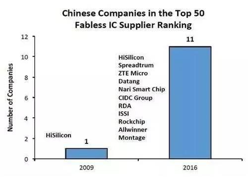 下圖是IC insight的報告,全球純芯片設計公司50強,2009年中國只有一家,也是中國第一家闖入世界50強的是華為旗下的海思公司,2016年增長到了11家,包括海思,展訊,中興,大唐,南瑞,華大,鋭迪科,ISSI,瑞芯微(Rockchip),全志(All winner),瀾起科技(Montage)。