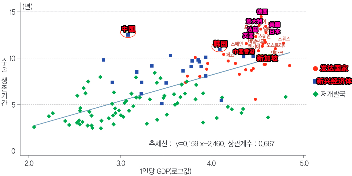 報告認為人均GDP(橫軸)和出口商品存活期限(縱軸)存在一定的關聯,除了某例外國家 本文圖表均摘自報告