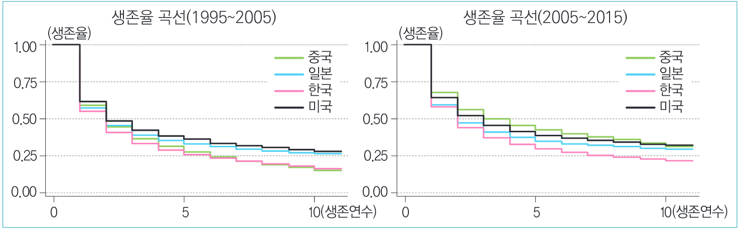 藍色為1年出口存活率,紅色是5年,綠色是十年,從前往後分別是中國、美國、日本、韓國