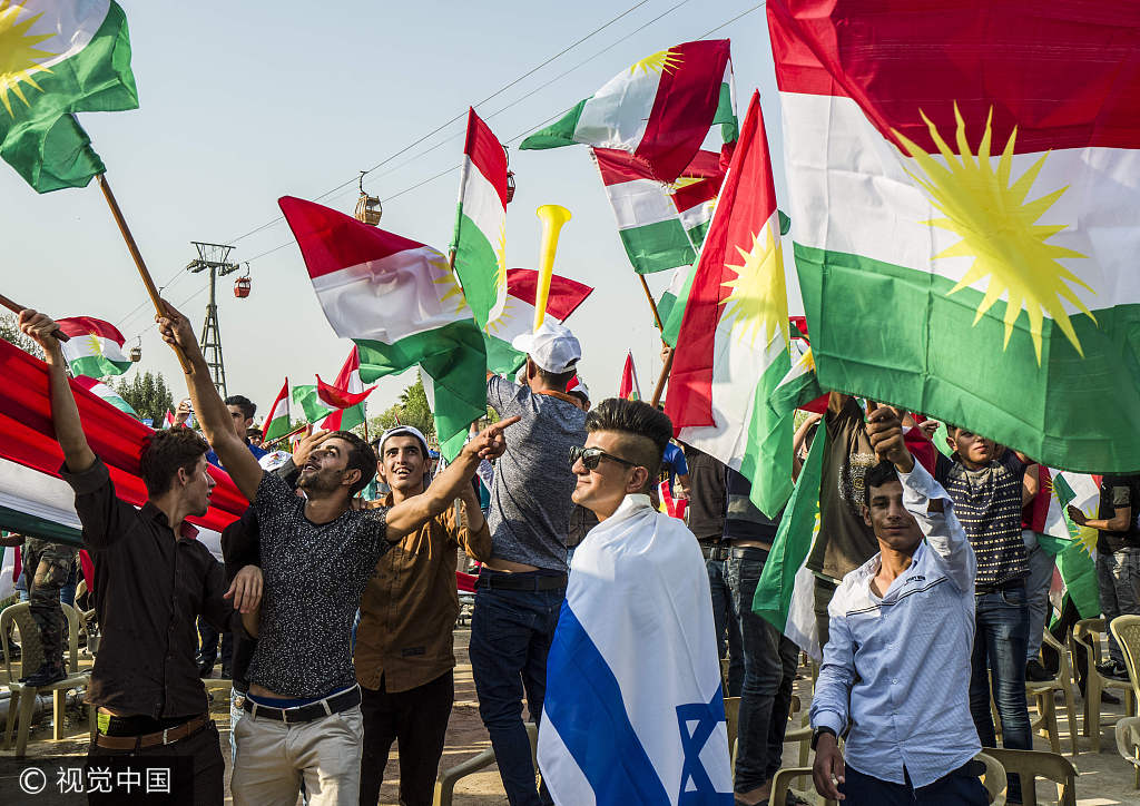 “今日俄羅斯”(RT)9月17日報道,為聲援即將在9月25日舉行的伊拉克庫區獨立公投,庫區首府埃爾比勒週六舉行了大規模集會,數千人蔘加。人羣揮舞着庫爾德斯坦旗幟,還燃放煙花慶祝。在一片三色太陽旗的海洋裏,藍白六角星的以色列國旗格外顯眼。