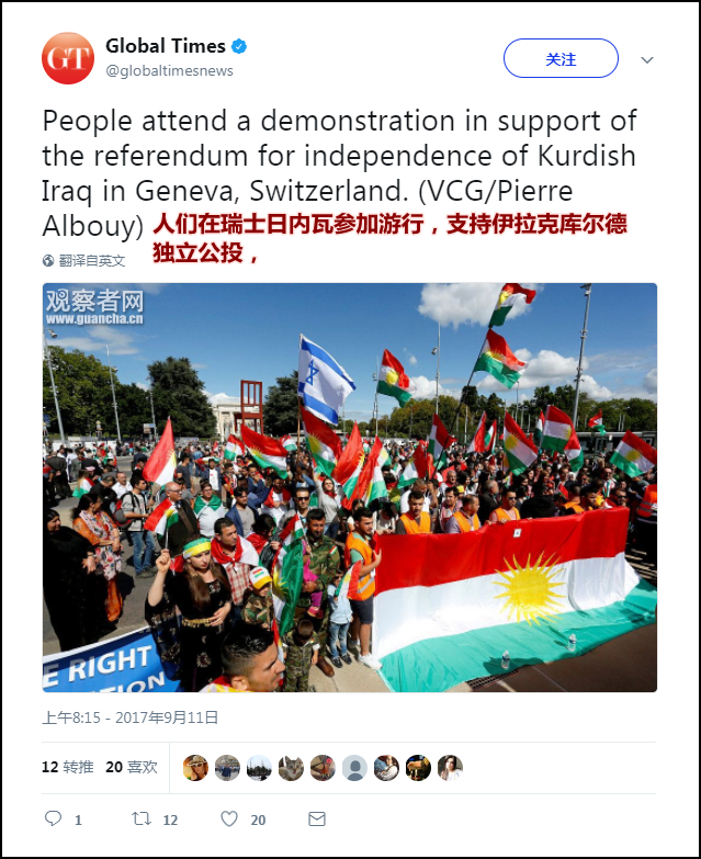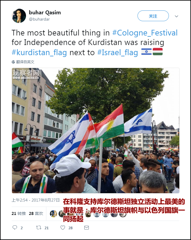 近來,只要有庫爾德獨立遊行的地方就有以色列國旗的身影。8月下旬先是出現在德國科隆,隨後出現在瑞士日內瓦和挪威奧斯陸。本月15日,庫區議會正式通過公投計劃後,庫區以及海外庫爾德人為聲援獨立公投舉行的遊行規模更是一場比一場大。