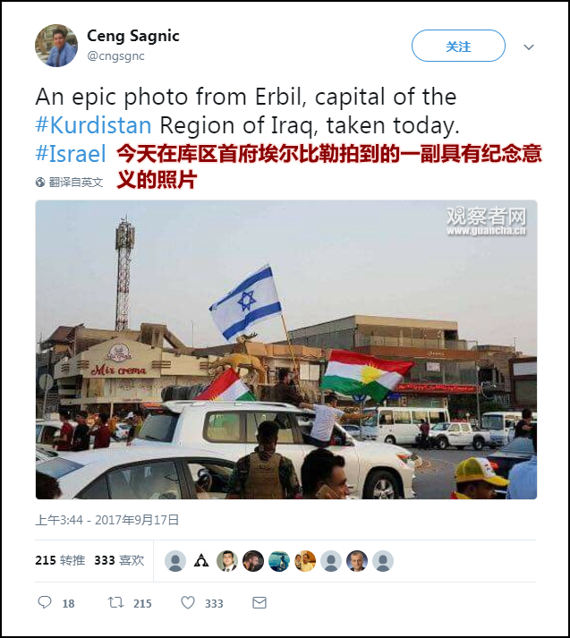 在這種背景下,以色列的聲援就更顯得彌足珍貴。《耶路撒冷郵報》還憤憤不平地表示,西方支持舉行蘇格蘭獨立公投或是英國脱歐,但面對庫爾德人同樣嚮往自由的民主意願卻不聞不顧。