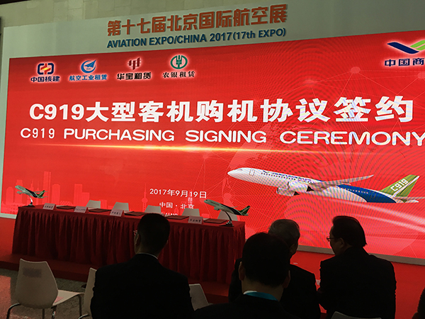 9月19日,中國商飛公司宣佈與中國核建、航空工業租賃、華寶租賃、農銀租賃簽訂130架C919購機框架協議 圖片來源:澎湃新聞