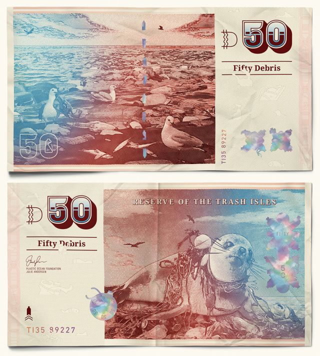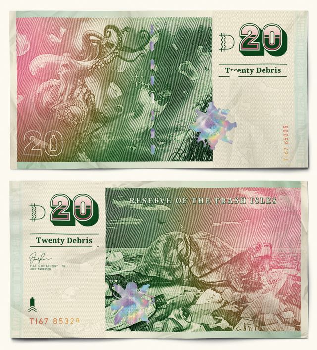 垃圾島的貨幣設計也非常有“當地特色”。相較於大多數國家使用風景名勝和歷史名人不同,垃圾島採用的都是動物如何遭受到垃圾的“迫害”的圖片。比如烏龜因為塑料圈套住而變得畸形。
