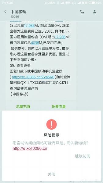 昨天,記者點開這條鏈接,頁面馬上彈出“訪問的網站可能有風險”的提示。繼續訪問後,彈出一個顯示“中國移動活動中心”的頁面。頁面中有充值100元送100元的活動提示。