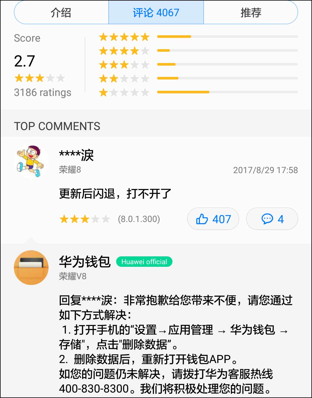 另一方面Huawei Pay自身APP用户體驗不佳。在華為商城裏,3186人給華為錢包打出的平均星級評分是2.7。在熱門評論中,用户反饋APP更新後出現閃退。