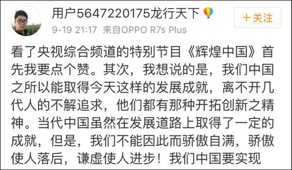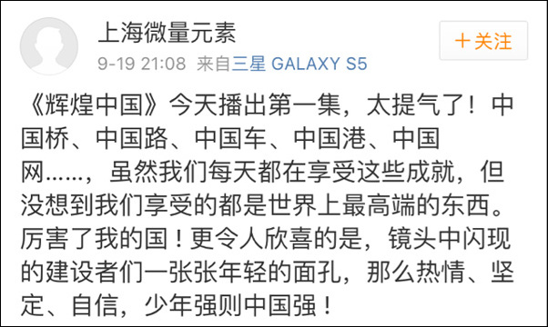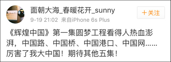 9月19日晚,六集電視紀錄片《輝煌中國》正式播出。這是由中宣部和中央電視台聯合制作的。接下來5天還會繼續更新。
