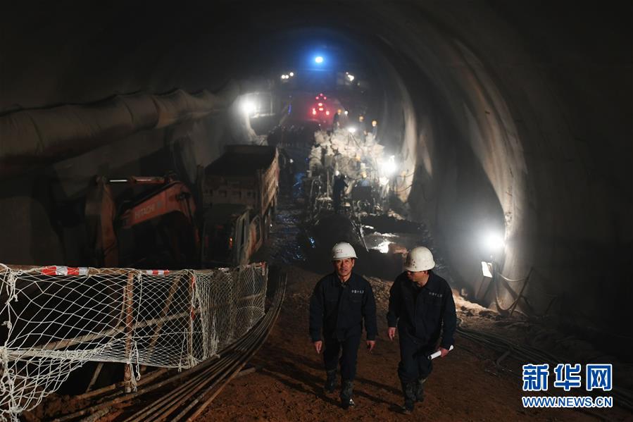 2017年2月6日,兩名技術人員從蘭渝鐵路胡麻嶺隧道施工作業面走過。圖片來源:新華網