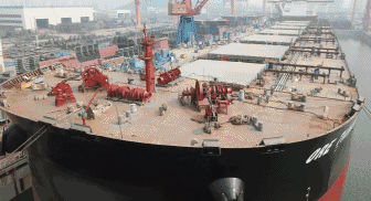 中國造世界最大礦砂船在青島下水 體型迫近遼寧號