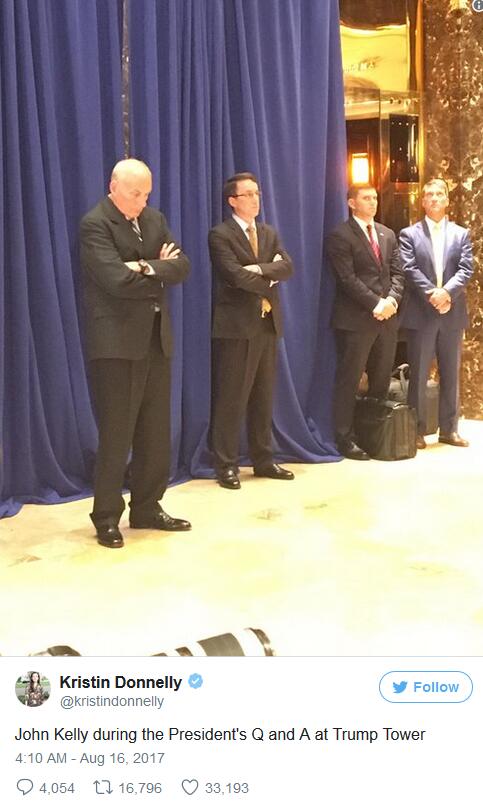 在弗吉尼亞州夏洛茨維爾(Charlottesville)的白人至上主義者集會後,凱利在8月的新聞發佈會上的表情。